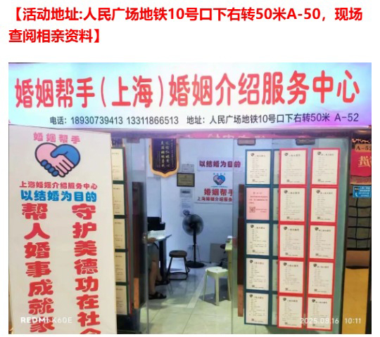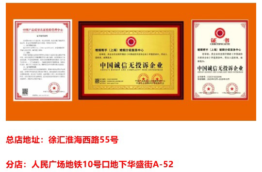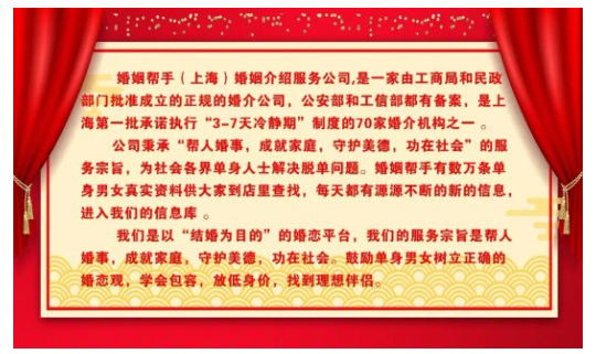 婚姻帮手(上海)婚姻介绍服务中心 联系人:黄老师 手 机:18930739413 电 话:18930739413 地 址:上海徐汇区淮海西路55号3层320室
